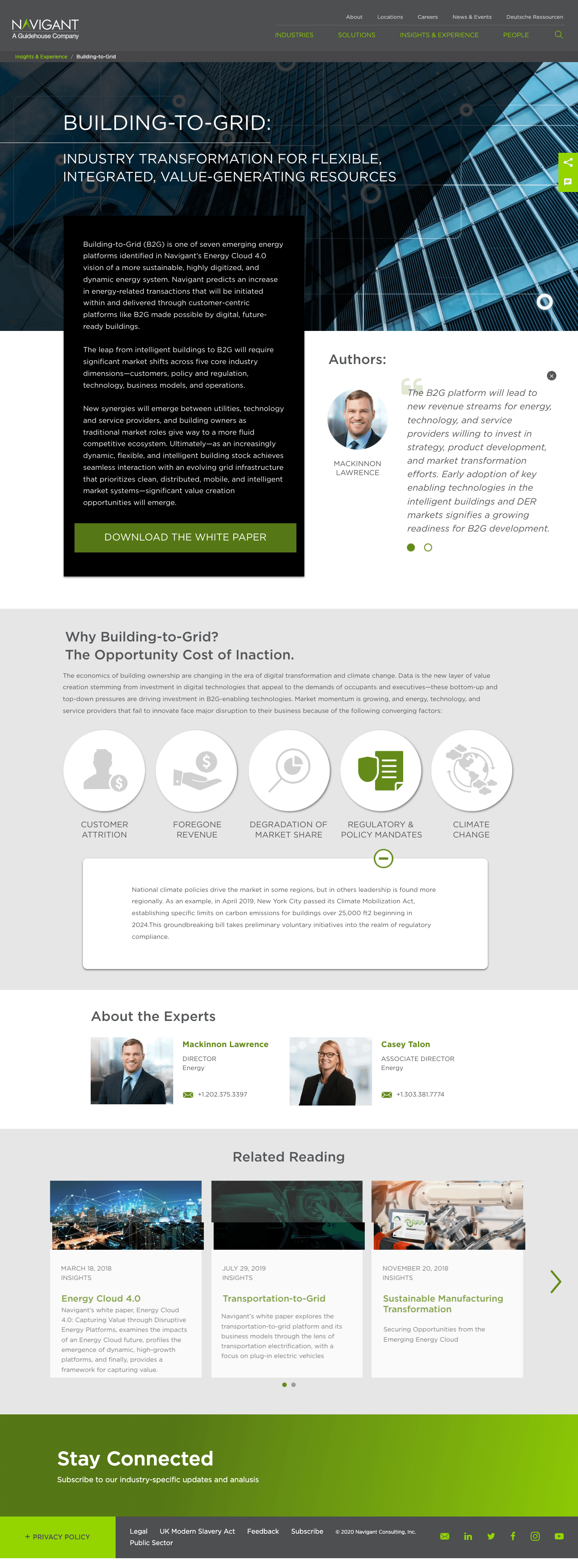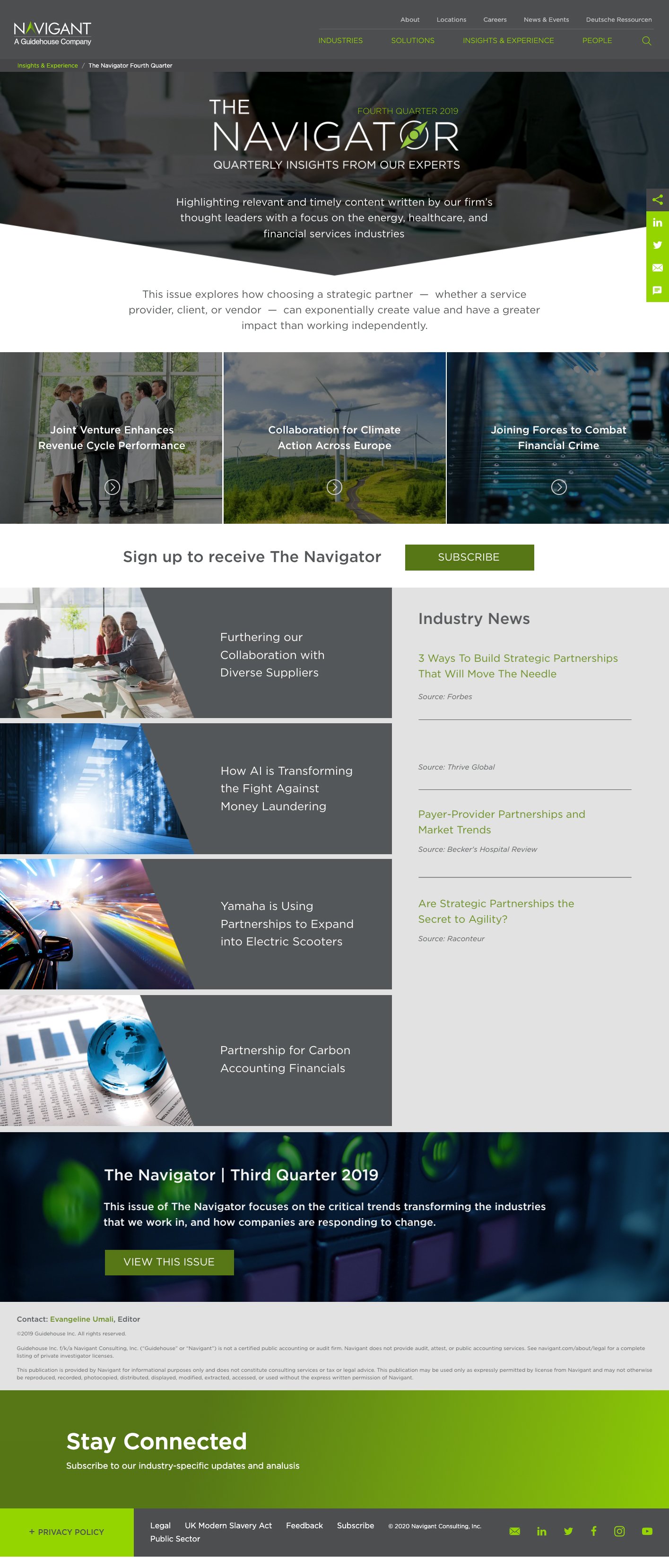 I led the creation of several interactive pages for Navigant's website to boost visitor engagement and gather insights into customer interests to find what potential clients found engaging when discussing specific “hot-topics” within their practices by gathering data on clicks throughout the interactive pieces. A key project within this initiative was the development of the "Navigator" quarterly newsletter, where myself, a copywriter, and key consulting leaders from Navigant's practices (Energy, Healthcare, Discovery, and Construction). This cross-functional effort, initiated as a pilot project at the request of our Chief Marketing Officer (CMO), tested the effectiveness of these pages in engaging visitors, collecting actionable data, and identifying valuable interest points to promote in the future.